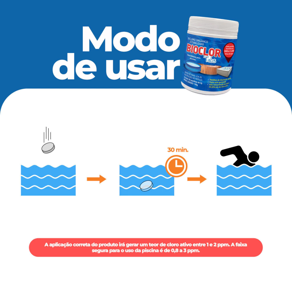 À base de Dicloro Orgânico Estabilizado, Bioclor Tabs foi desenvolvido para o tratamento rápido e prático da água de piscinas plásticas, infláveis, desmontáveis, ofurôs e banheiras. Mesmo com a renovação frequente, esses ambientes exigem cuidados para evitar a proliferação de bactérias. O produto age contra contaminantes causados pelo uso e pela presença de matéria orgânica eliminada pelo corpo humano. Garantia de higiene e segurança para toda a família.