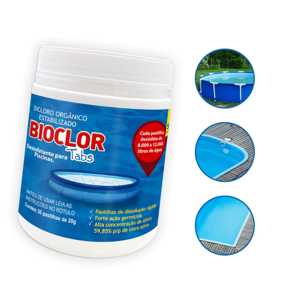 À base de Dicloro Orgânico Estabilizado, Bioclor Tabs foi desenvolvido para o tratamento rápido e prático da água de piscinas plásticas, infláveis, desmontáveis, ofurôs e banheiras. Mesmo com a renovação frequente, esses ambientes exigem cuidados para evitar a proliferação de bactérias. O produto age contra contaminantes causados pelo uso e pela presença de matéria orgânica eliminada pelo corpo humano. Garantia de higiene e segurança para toda a família.